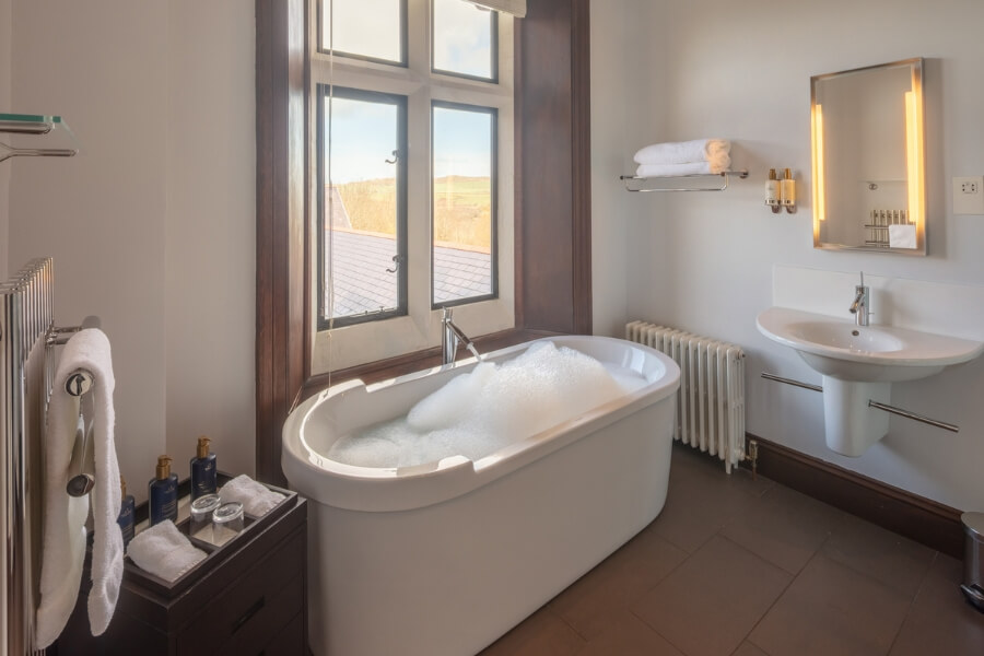 A comfortable room featuring views of Carn Llidi's rocky outcrop and a separate standalone bath.